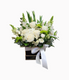 Beautiful assortment of white and blush-pink flowers. Roses, carnations, alstromerias, tulips arranged in a paper box. Our boxes come in black and white colours.