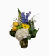 Metallic container with blue hydrangea, white spray roses, and white gerberas and tulips if in season. Size: H12" x W12" As Shown: NB-003 ...