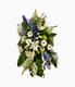Traditional standing spray with red and white flowers; gerberas, roses, lilies, carnations and alstromerias. Accented with some foliage.
