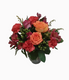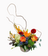 Low vase arrangement in a small ceramic or glass container. Greens, orange, yellow and burgundy colors. Some flower substitution may apply